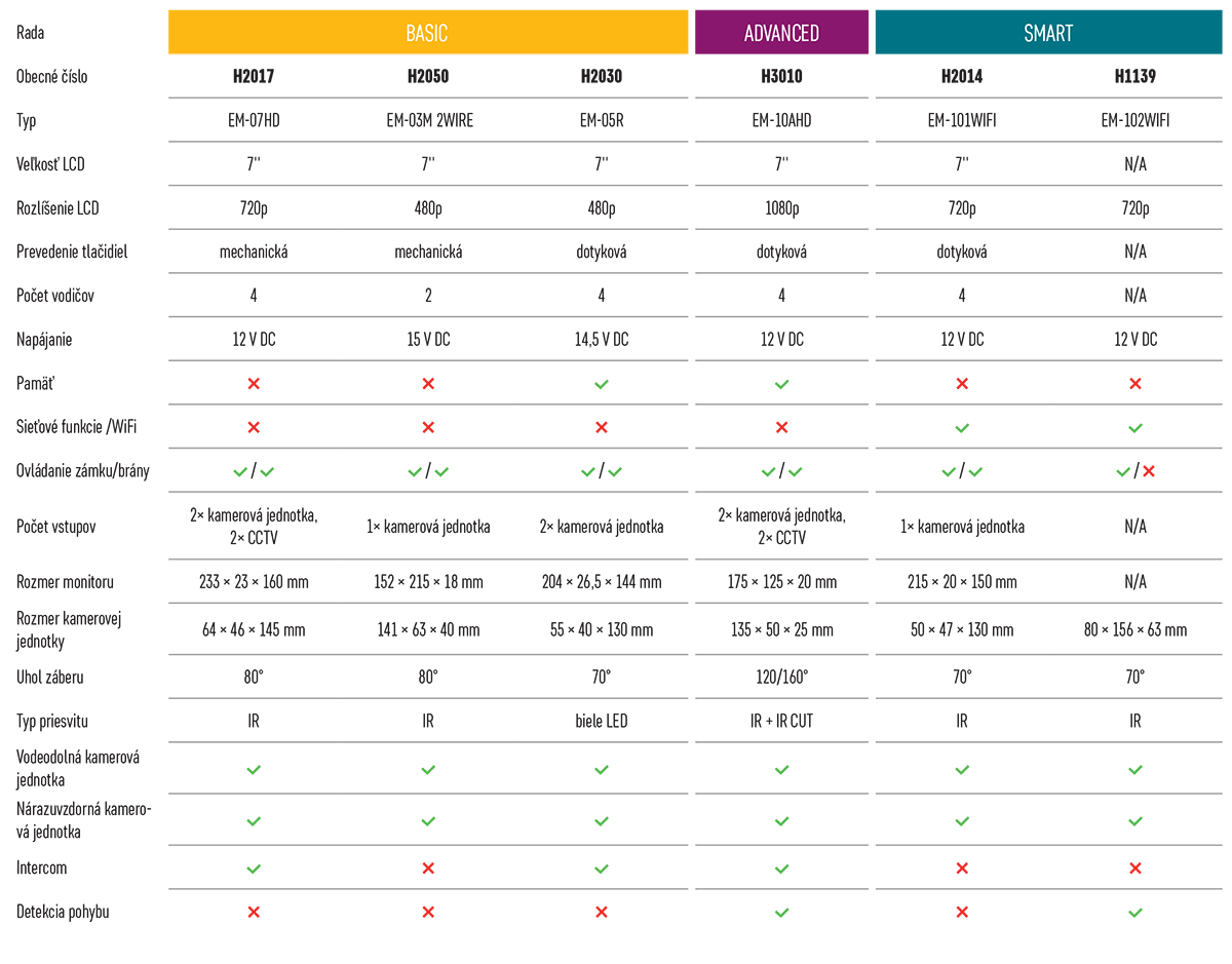 Spoločným znakom videotelefónov rady BASIC, ADVANCED a SMART je 7“ LCD displej umiestnený v interiéri. U rady BASIC nájdete v rozlíšení 480p alebo 720p, rada ADVANCED disponuje vysokým rozlíšením 1080p a modely rady SMART ponúkajú rozlíšenie 720p.