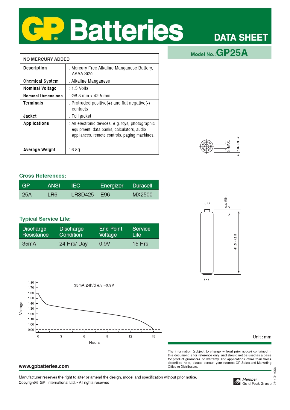 | typové označenie | GP 25A (AAAA, LR61, LR8, MN2500) |