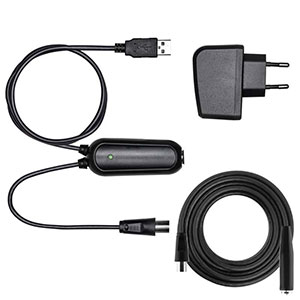 Chceli by ste anténu používať aj v miestach bez sieťového napätia 230 V, napríklad v karavane alebo na dovolenke na lodi? Žiadny problém. Anténa je napájaná pomocou USB adaptéra, ktorý umožňuje jej použitie všade tam, kde je dostupné napájanie USB portom. Anténa je dodávaná vrátane napájacieho zdroja v podobe USB kábla spolu s USB napájacím zdrojom. Súčasťou balenia je aj koaxiálny päťmetrový kábel osadený konektormi, ktorý uľahčí inštaláciu antény. Pre napájanie možno využiť aj USB port priamo v TV alebo set-top boxu.