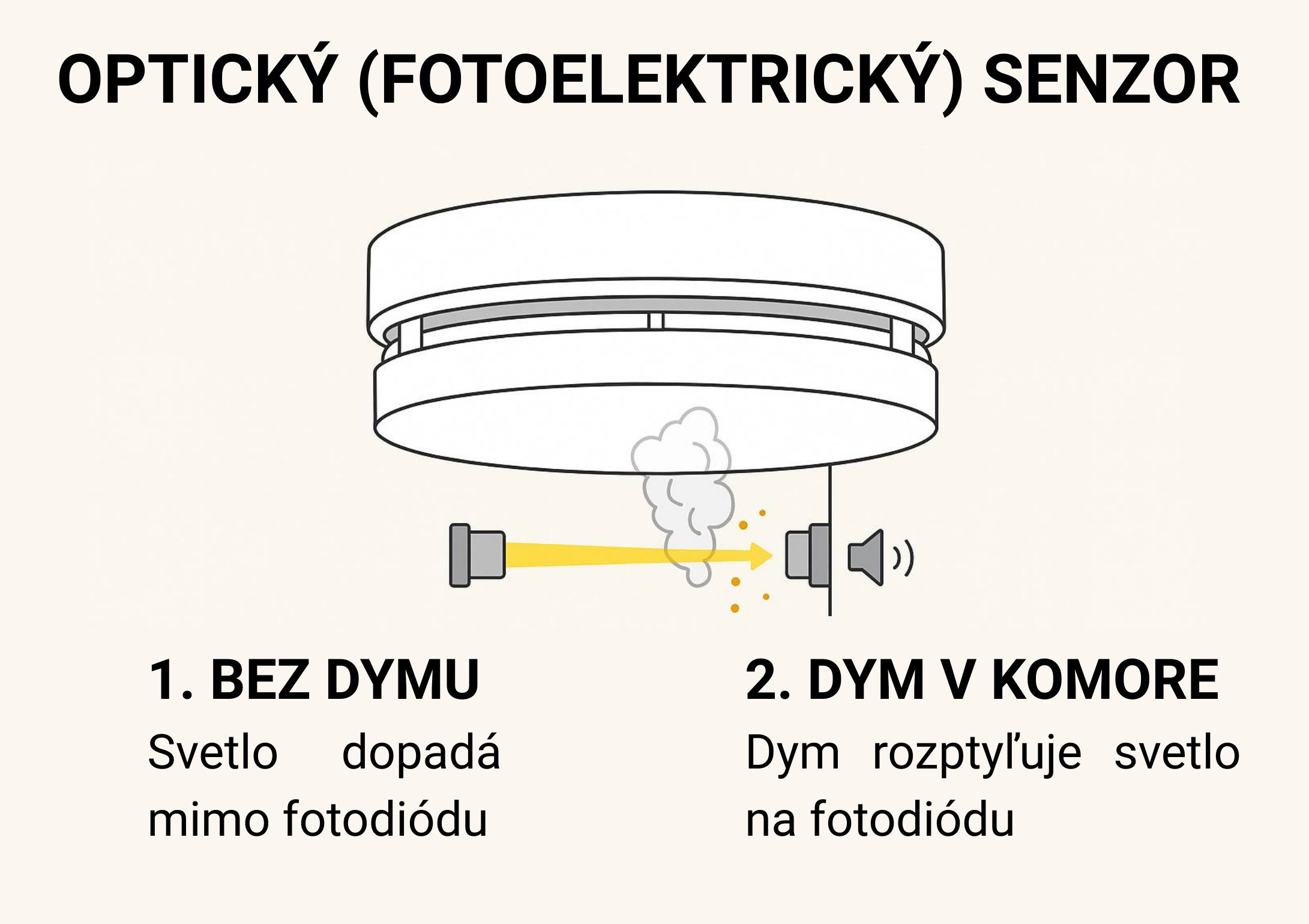 Senzor reaguje na prítomnosť viditeľných častíc dymu vo vzduchu. Nezaznamenáva však plyn, teplotu ani plameň. Preto je dobré ho doplniť o detektor oxidu uhoľnatého, ak máte v domácnosti spotrebiče na plyn alebo tuhé palivá. Najlepšie zachytí tlejúce požiare napr. horiace káble či preťažené zásuvky. Ich výhodou je, že sú menej náchylné na falošné poplachy (napr. z pary), ak sú správne umiestnené.