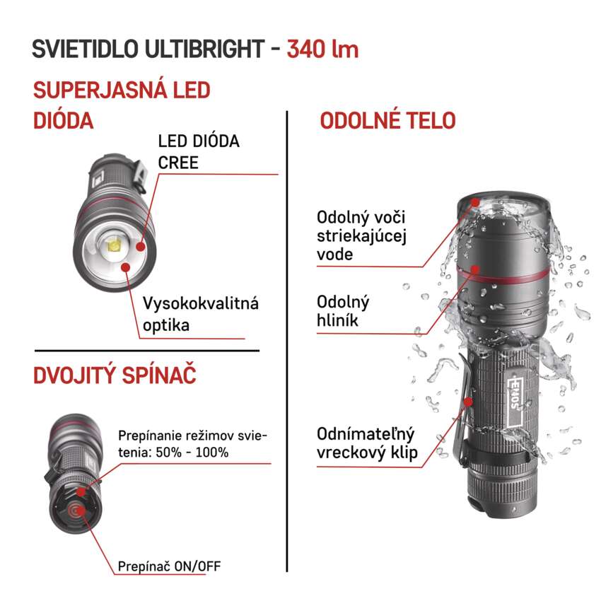 LED svietidlo Ultibright 70 vás nikdy nenechá v štichu. Či už ste práve v prírode, na ceste autom, alebo si v práci potrebujete pohotovo posvietiť na zle dostupné miesto, vodeodolné svietidlo so stupňom krytia IP65 je presne tým, čo potrebujete. A keď k tomu ešte pridáte to, že je nárazuvzdorné a nezaskočí ho ani pád na tvrdý povrch, potom si baterku EMOS Ultibright 70 priamo zamilujete.