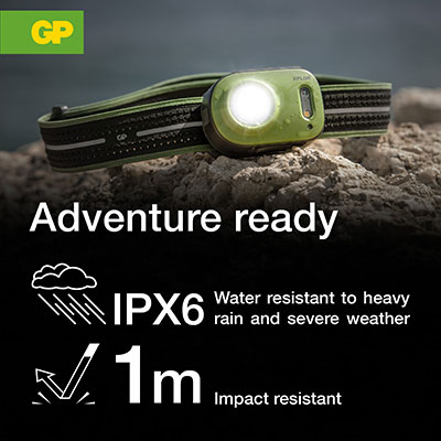 Čelovka GP Xplor PHR17 je nárazuvzdorná, vydrží aj potenciálne pády z výšky 1 metra. Vďaka certifikácii IPX6 sa nemusíte obávať ani silného dažďa, ktorý jej neublíži.