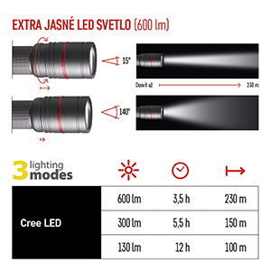 | doba svietenia detail | CREE LED 100 % – 3,5 h, CREE LED 50 % – 5,5 h, CREE LED 20 % – 12 h |