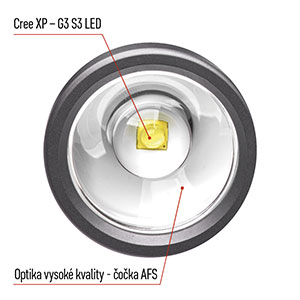 Svietidlo je praktické a kvalitné. Vďaka unikátnej patentovanej technológii AFS lens (Advanced Focus System) využívajúcej princíp lomu svetla, získate ostrý kužeľ svetla a zároveň rovnomernú intenzitu osvetlenia. Toto svetlo je vybavené fokusom, ktorý vám umožní plynule prejsť z širokého kužeľa svetla do úzkeho intenzívneho lúča svetla.