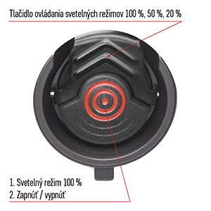 Druhé tlačidlo je pripravené pre rýchlu zmenu režimu svietenia, kedy môžete voliť medzi 100% výkonom svietidla, pri ňom svietidlo dosvieti na vzdialenosť až 230 m, 50% režimom svietenia s dosvitom až 150 m, alebo úsporným 20% režimom svietenia, ktorého dosvit dosahuje až 100 m.