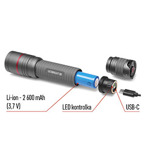 O stave nabíjania vás priebežne informuje LED signalizácia. Ak sa svietidlo nabíja, signalizácia svieti na červeno. Akonáhle je svietidlo opäť pripravené na používanie, dióda sa rozsvieti na zeleno.