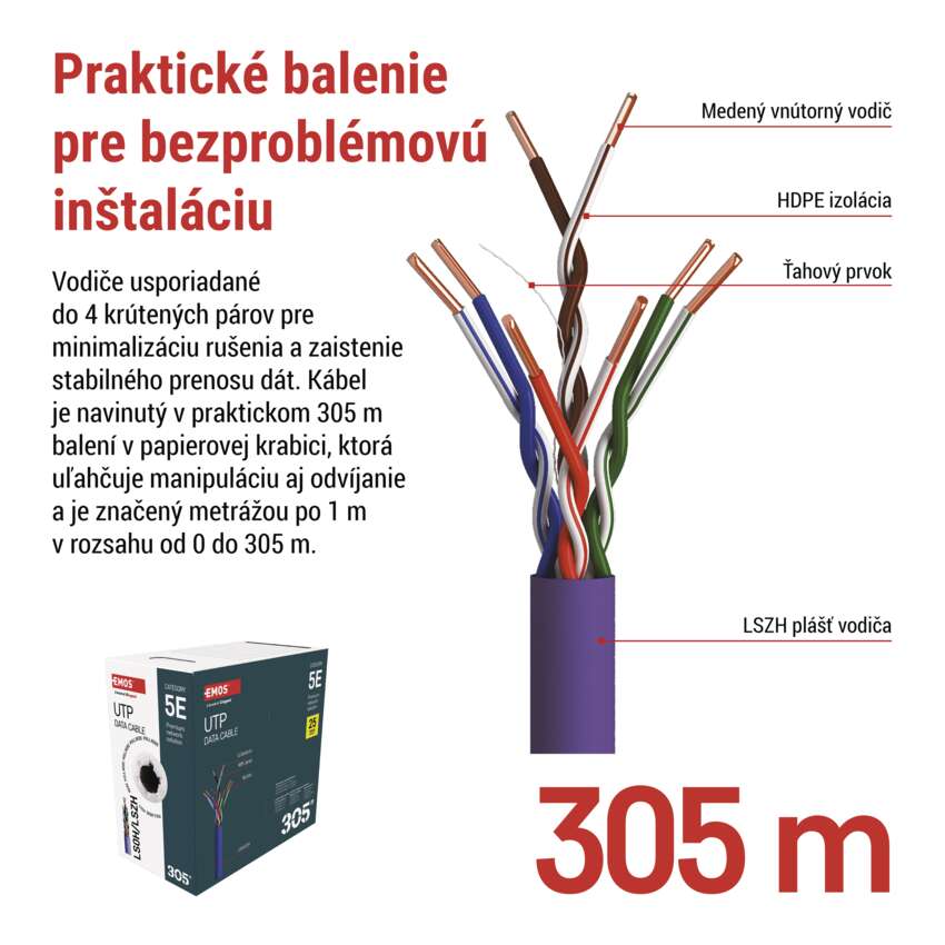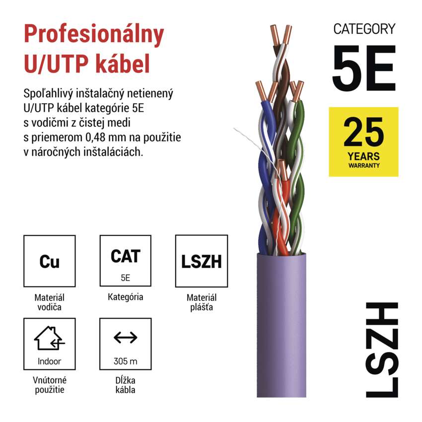 Kvalitný netienený UTP kábel CAT5E s LSZH plášťom.Vodiče jednotlivých párov sú vyrobené z nerecyklovaného medeného drôtu o priemere 0,49mm a ten je optimalizovaný pre bezproblémové fungovanie ethernetových protokolov, ktoré sa dnes v štruktúrovanej kabeláži kategórie 5E používajú najčastejšie.Inštalačný UTP kábel je určený pre horizontálne rozvody počítačových telekomunikačných sietí (štruktúrovaná kabeláž) a dodáva sa v prevedení s plášťom LSZH.Kábel sa dodáva v kartónovom boxe v návine 305m s vyznačenou metrážou 0-305m.Farba plášťa je sivá.