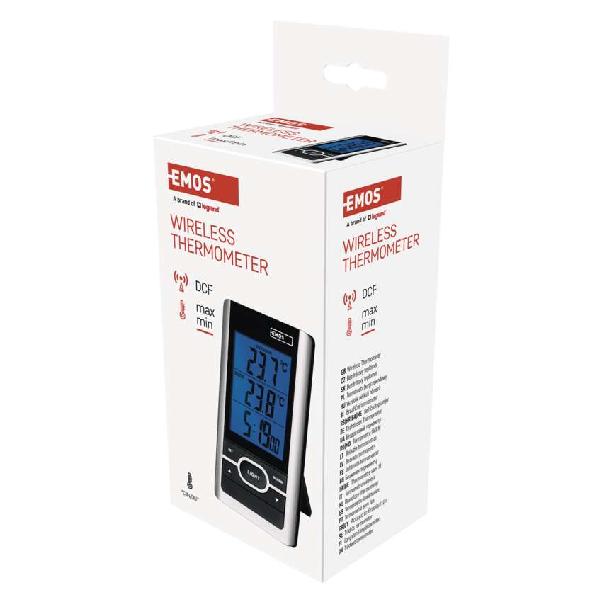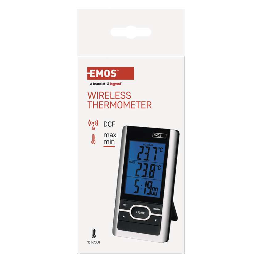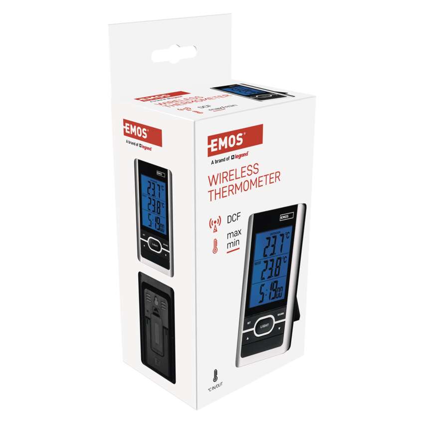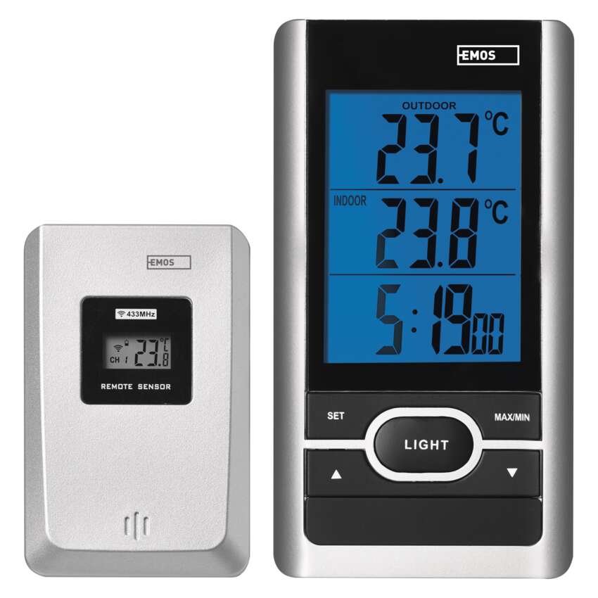 Bezdrôtový teplomer s modrým podsvietením displeja. K teplomeru sa pripája jedno bezdrôtové čidlo s dosahom až 60 m. Teplomer má hodiny riadené DCF signálom.