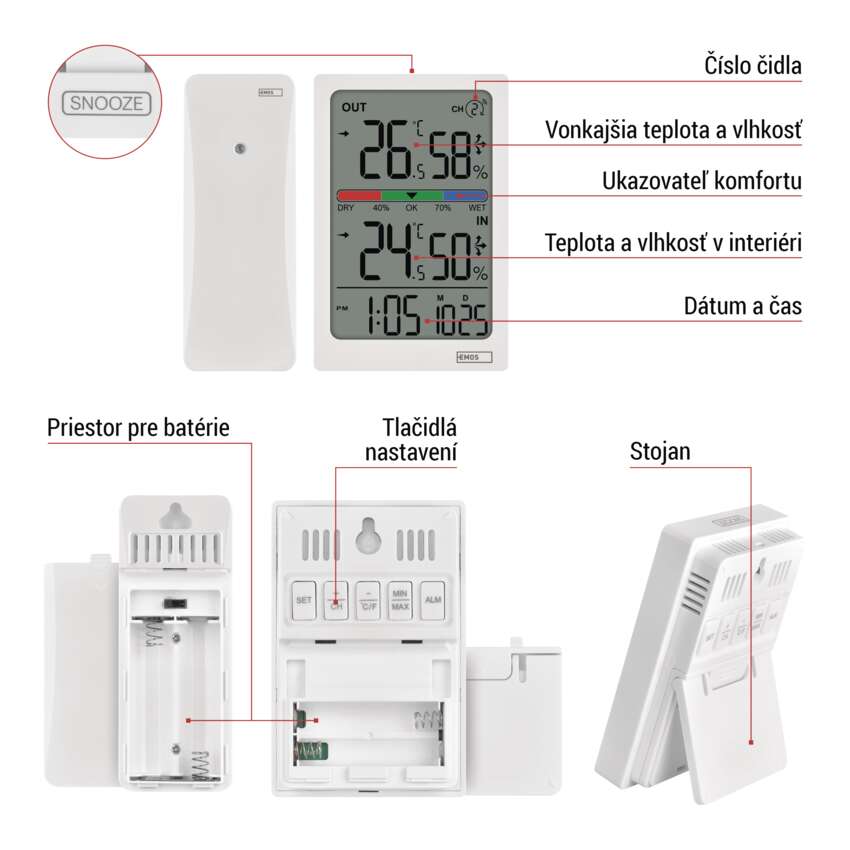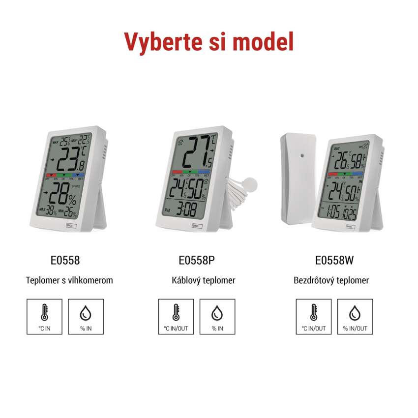 Digitálny teplomer s vlhkomerom, bezdrôtový snímač, budík, dátum E0558W