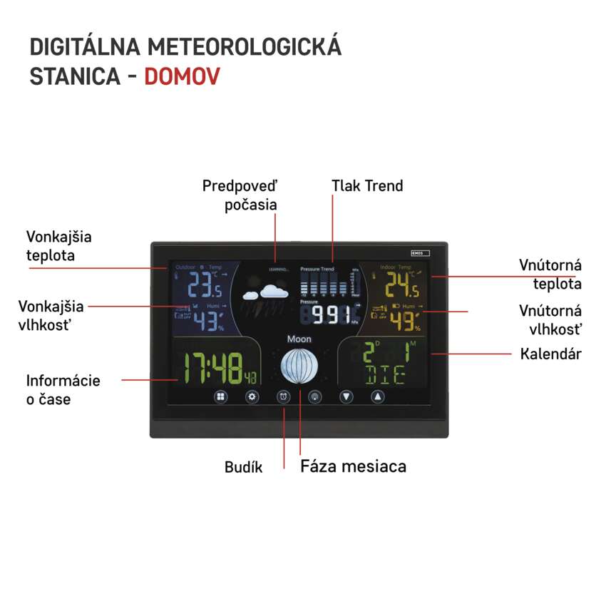 K ďalším prednostiam domácej meteostanice EMOS patrí ukazovateľ vnútornej a vonkajšej vlhkosti, zobrazenie trendu teploty, tlaku a fázy mesiaca a taktiež barometer, vďaka nemu budete mať prehľad o atmosférickom tlaku. Môžete sa spoľahnúť i na teplotnú výstrahu a na funkciu korekcie nadmorskej výšky.