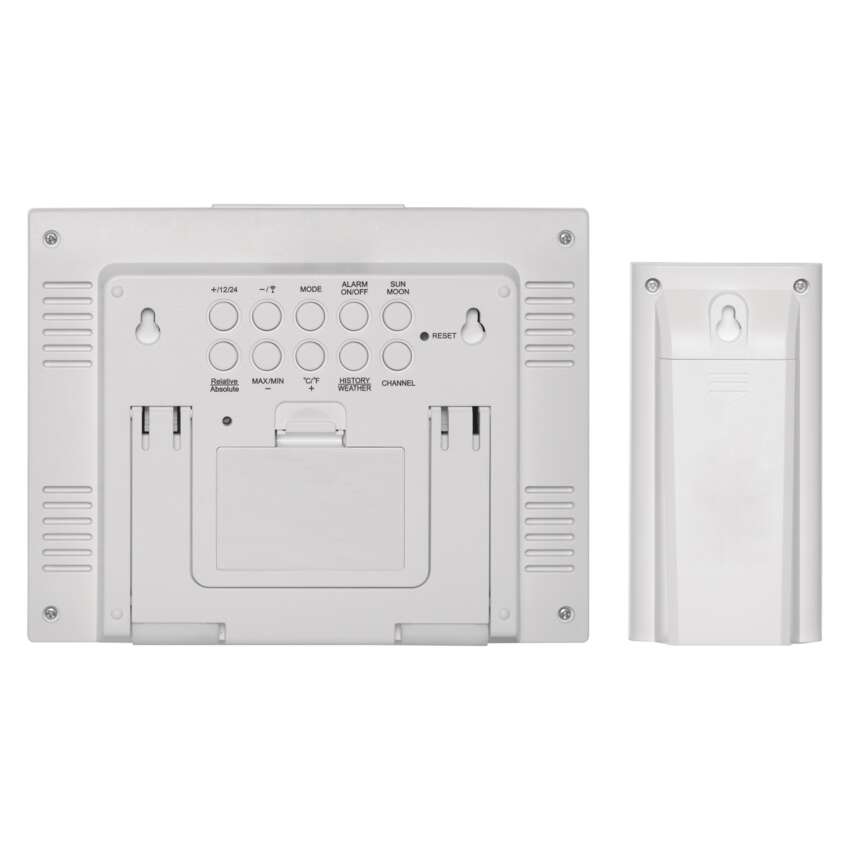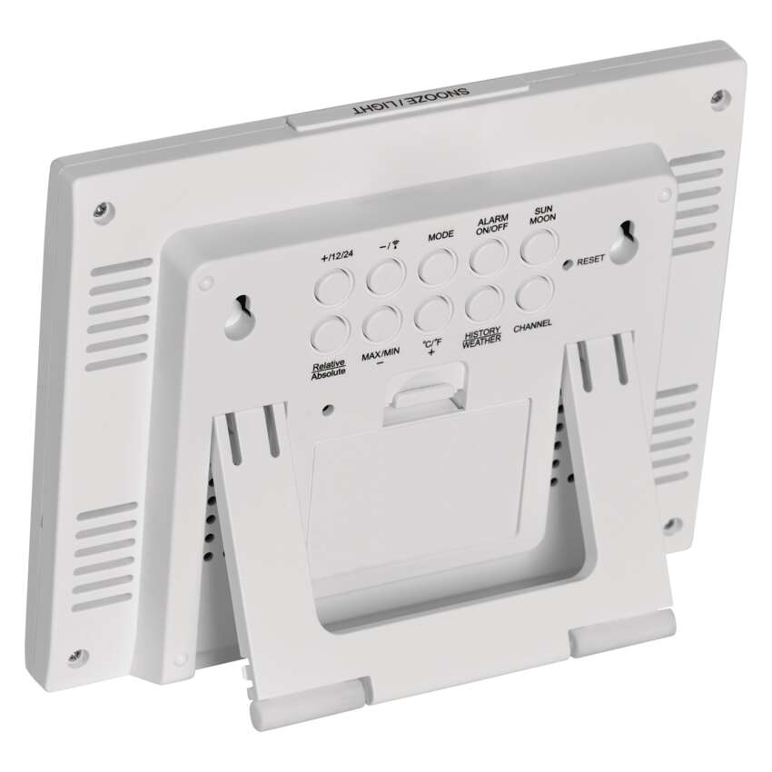 V zadnej časti meteostanice E8835 nájdete praktický výklopný stojanček, ktorý vám umožní nastaviť si ju do takej pozície, v ktorej sa bude na vašom parapete, nočnom stolíku, poličke alebo v obývačkové stene najlepšie vynímať. Nemenej skvele však bude vyzerať aj primontovaná na stene, kde ju udržia len 2 malé skrutky.