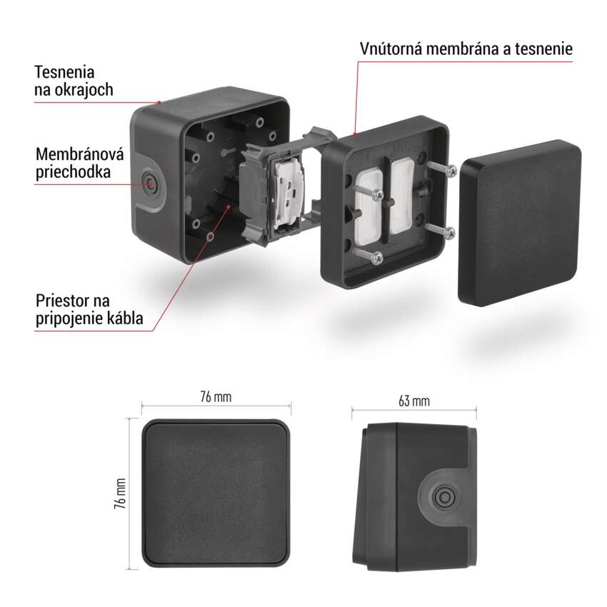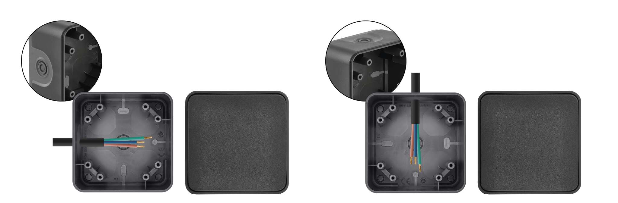 Horizontálna a vertikálna montáž. Pružné tesnenie chráni pred nežiaducimi vplyvmi prostredia. Priechod pre kábel umožňuje jednoduché pripojenie kábla alebo objímky, čo zaručuje univerzálnosť pre akýkoľvek typ inštalácie.
