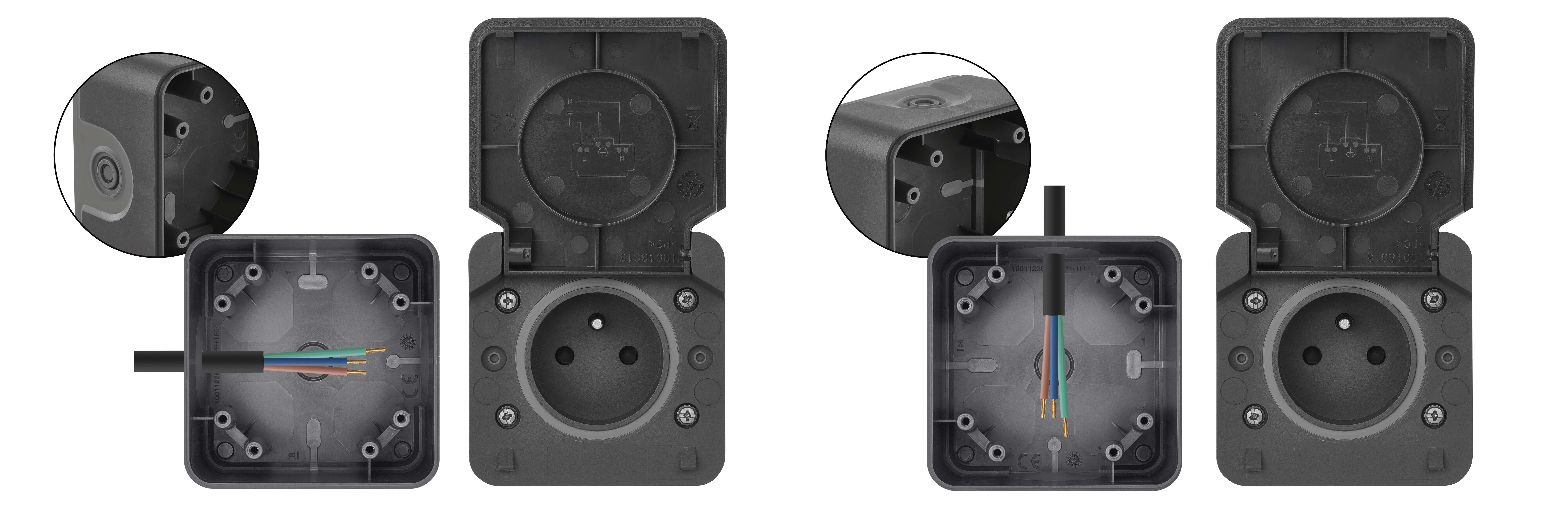 Horizontálna a vertikálna montáž. Pružné tesnenie chráni pred nežiaducimi vplyvmi prostredia. Priechod pre kábel umožňuje jednoduché pripojenie kábla alebo objímky, čo zaručuje univerzálnosť pre akýkoľvek typ inštalácie.