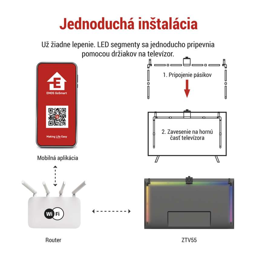 Osvetlenie GoSmart Ambient LED TV posúva zážitok zo sledovania televízora na úplne novú úroveň. Vďaka synchronizačnej kamere HD sa podsvietenie automaticky prispôsobuje farbám na obrazovke a vytvára dokonalý vizuálny efekt. Všetko ovládanie a nastavenia sa vykonávajú prostredníctvom mobilnej aplikácie EMOS GoSmart, ktorá je k dispozícii pre systémy Android aj iOS.