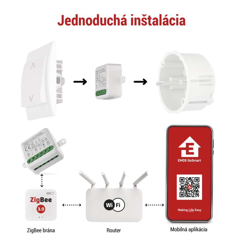 Inteligentný modul možno pripojiť k ďalším zariadeniam vo vašej domácnosti (hodiny, svetlá, dverové, okenné a vykurovacie senzory). Po spárovaní s mobilnou aplikáciou EMOS GoSmart môžete automatizovať, vytvárať scenáre a plánovať časy pre jednotlivé spotrebiče. Napríklad naplánovať budenie vyťahovaním žalúzií alebo automaticky zatemniť okná vo vopred naplánovanom čase vo vašej neprítomnosti. Vytvorte si inteligentný domov, ktorý sa prispôsobí vašim potrebám.