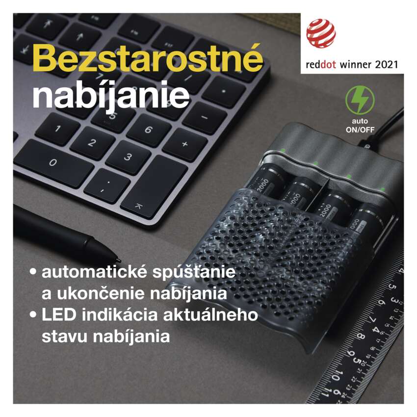 Vstupné USB rozhranie nabíjačky umožňuje jej použitie takmer kdekoľvek. Batérie tak môžete nabíjať pomocou autoadaptéra, cez USB port vášho notebooku, či powerbanky alebo priamo zo siete bez ohľadu na to, či ste práve doma, v meste, alebo v prírode.