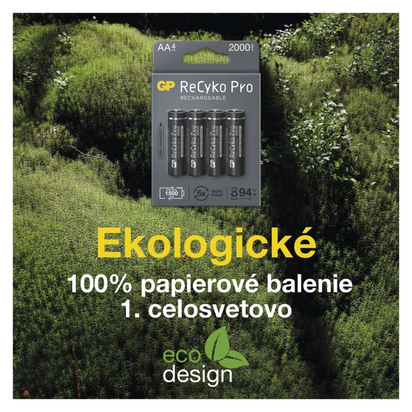 Batérie ReCyko a nabíjačka ReCyko Pre sou skvelou kombináciou pre bezpečné a ekologické nabíjanie. Nielenže nabíjačka šetrí životnosť batérií a tým minimalizuje ekologickú záťaž, batérie GP ReCyko sú navyše vyrobené tak, aby boli šetrné k životnému prostrediu. Pri výrobe sú využívané už recyklované zdroje. Recyklovateľná je aj väčšina materiálov, z ktorých sú batérie vyrobené. Spoločnosť GP navyše myslela aj na ekologické papierové balenie. Batérie a nabíjačky GP sú tak skvelými produktmi pre všetkých, ktorým na prírode záleží.