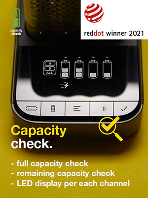 Chystáte sa na cesty, potrebujete mať k dispozícii plne nabité prístroje a nie ste si istí, aká je aktuálna kondícia vašich batérií? S nabíjačkou Pro jednoducho zistíte, ako na tom vaše nabíjacie batérie sú. Spustite proces merania kapacity a na displeji dokovacej stanice sa vám po jeho dokončení zobrazí ich kapacita pre každú batériu zvlášť. O aktuálnej kondícii svojich batérií tak budete mať vždy perfektný prehľad. Tento proces síce pre výkonnejšie články zaberie aj viac ako 24 hodín, ale iste sa ten pocit oplatí.