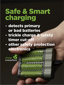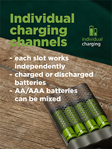 Vstupné USB rozhranie nabíjačky umožňuje jej použitie takmer kdekoľvek. Batérie tak môžete nabíjať pomocou autoadaptéra, cez USB port vášho notebooku, či powerbanku alebo priamo zo siete bez ohľadu na to, či ste práve doma, v meste, alebo v prírode.