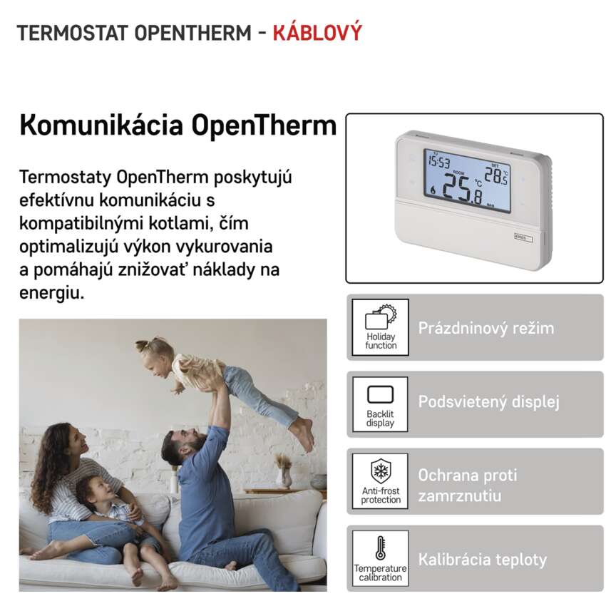 Objavte komfort ovládania vykurovacieho systému a úsporu času a nákladov. Výhodou káblového termostatu je jeho stabilný prenos informácií medzi kotlom a termostatom. Podsvietený displej umožňuje jednoduché ovládanie a programovanie až šiestich zmien teploty za deň. Dokonalú reguláciu zabezpečuje nastavenie teploty od 5 °C do 35 °C. Termostat vyniká možnosťou pripojenia kotla, ktorý podporuje komunikáciu OpenTherm a konvenčné spínanie prostredníctvom spínaného kontaktu (relé). Vďaka funkciám Zámok a Dovolenka budete mať každý deň plnú kontrolu nad vykurovaním svojho bytu alebo domu či kancelárie.