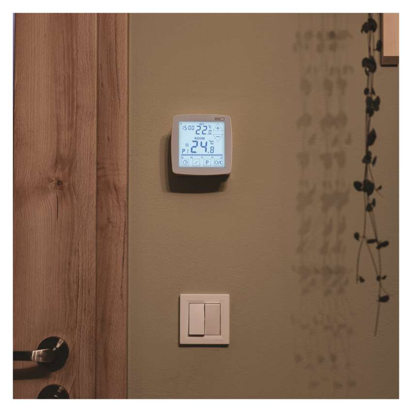 Termostat P56A02 spája praktickú funkčnosť s moderným, nadčasovým dizajnom, ktorý sa hodí do každého interiéru. Podsvietený dotykový displej je prehľadný a intuitívny - veľké číslice uľahčujú prehľad o aktuálnej a nastavenej teplote a vďaka podsvieteniu sa pohodlne ovláda aj v noci bez nutnosti zapínať svetlo.