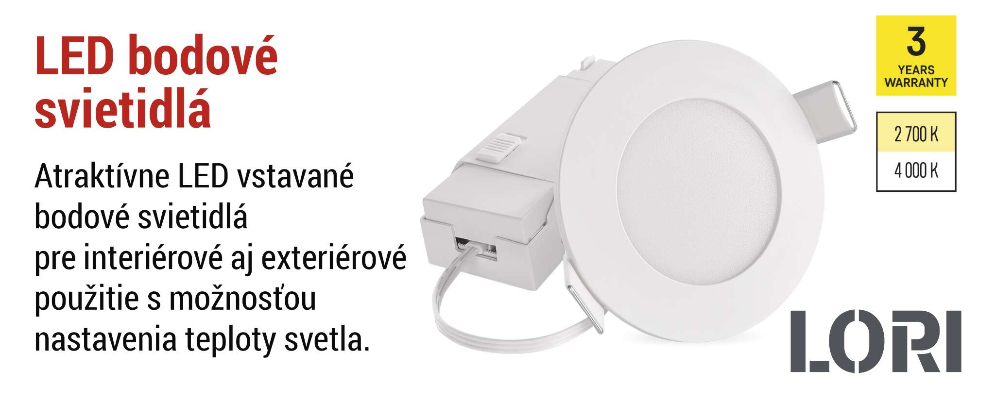 LORI je moderné vstavané bodové svietidlo s nízkou spotrebou energie 4,5 W a svetelným tokom 345 lúmenov. Vďaka širokému uhlu vyžarovania 110° dokonale osvetľuje zvolené miesto s príjemnou teplotou farieb 2 700 alebo 4 000 K. Jeho robustná konštrukcia a 3-ročná záruka z neho robia ideálnu voľbu pre náročné interiéry, kde sa kladie dôraz na spoľahlivosť, dizajn a energetickú účinnosť. Je ideálnou voľbou pre kúpeľne a iné miesta, kde sa vyžaduje krytie IP65.