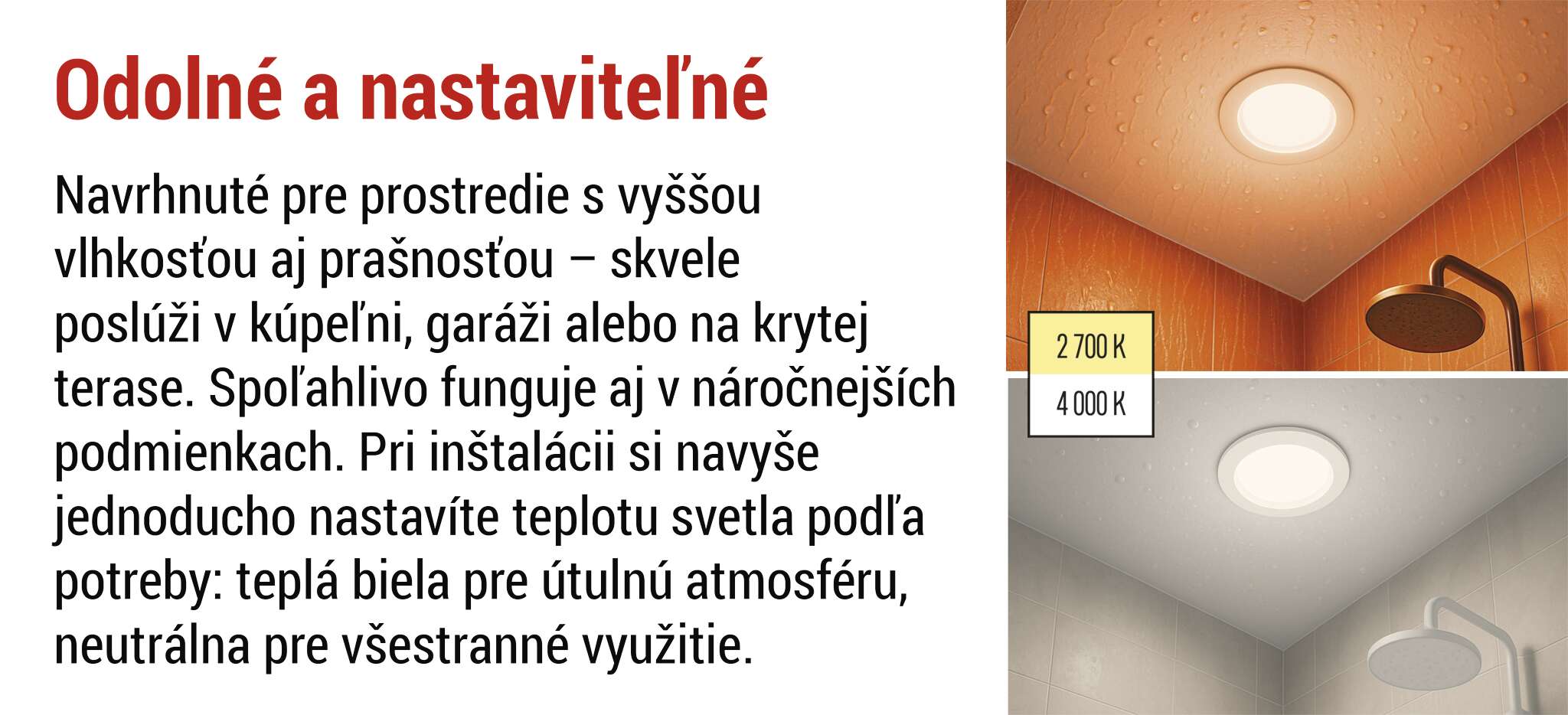 LORI je ideálnou voľbou pre každého, kto hľadá spoľahlivé, energeticky úsporné a dizajnovo čisté osvetlenie do mokrej miestnosti. Vďaka vysokému stupňu ochrany je odolné voči prachu a striekajúcej vode, čo z neho robí ideálne svietidlo do kúpeľní, kuchýň alebo komerčných priestorov. Svietidlo poskytuje príjemné, vysokokvalitné svetlo s verným podaním farieb. Svietidlo LORI je k dispozícii v klasickej bielej a hladkej čiernej variante, vďaka čomu sa ľahko začlení do každého interiéru a doplní jeho štýl. Navyše vďaka trojročnej záruke si môžete byť istí dlhodobou kvalitou a spoľahlivosťou.
