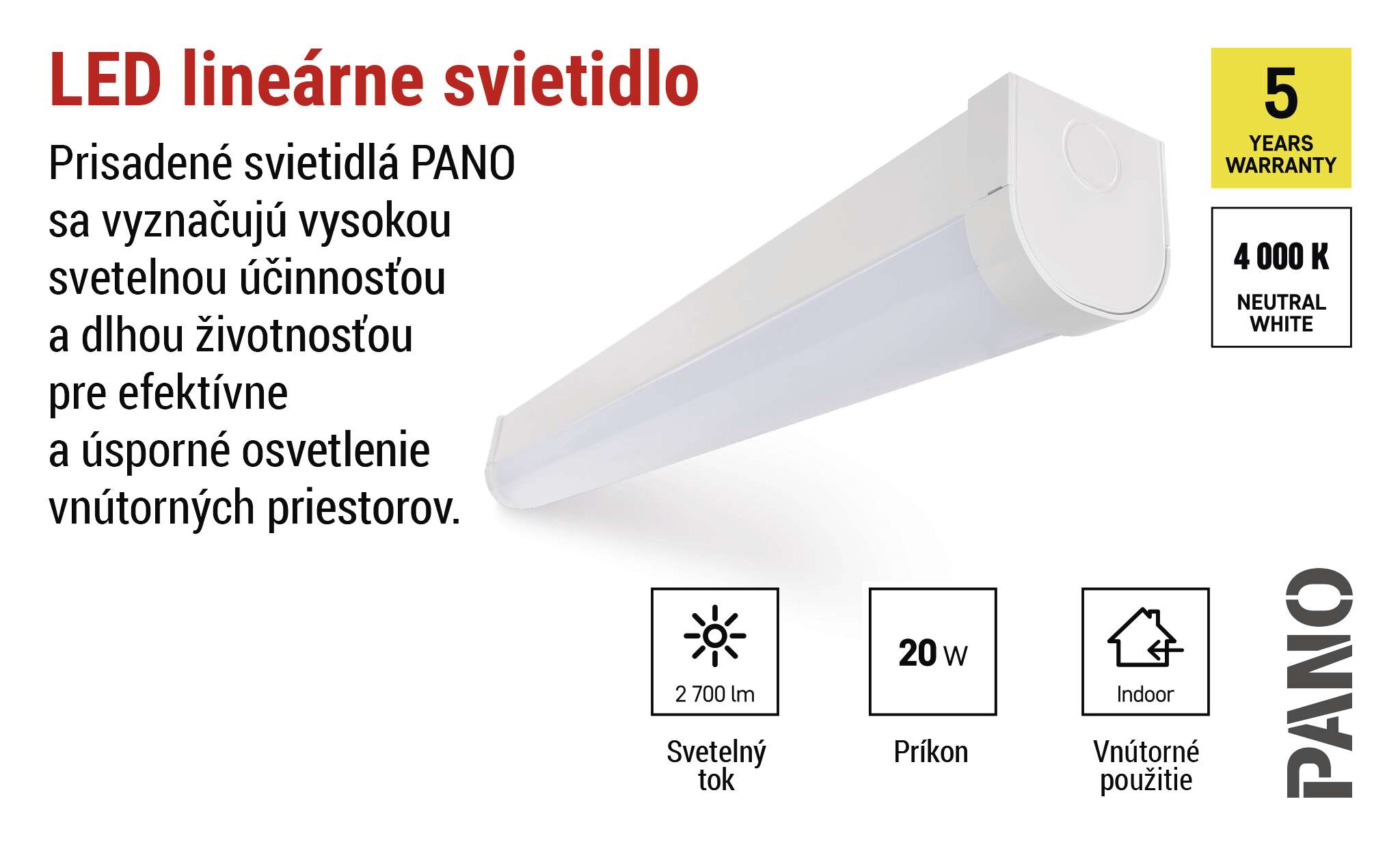 Lineárne svietidlá PANO sú navrhnuté tak, aby poskytovali spoľahlivé a rovnomerné osvetlenie, ktoré podporuje produktivitu a pohodlie. Moderný dizajn sa ľahko integruje do interiéru a kombinácia kvalitných materiálov s precíznym technickým spracovaním zaručuje dlhú životnosť a bezproblémovú prevádzku.