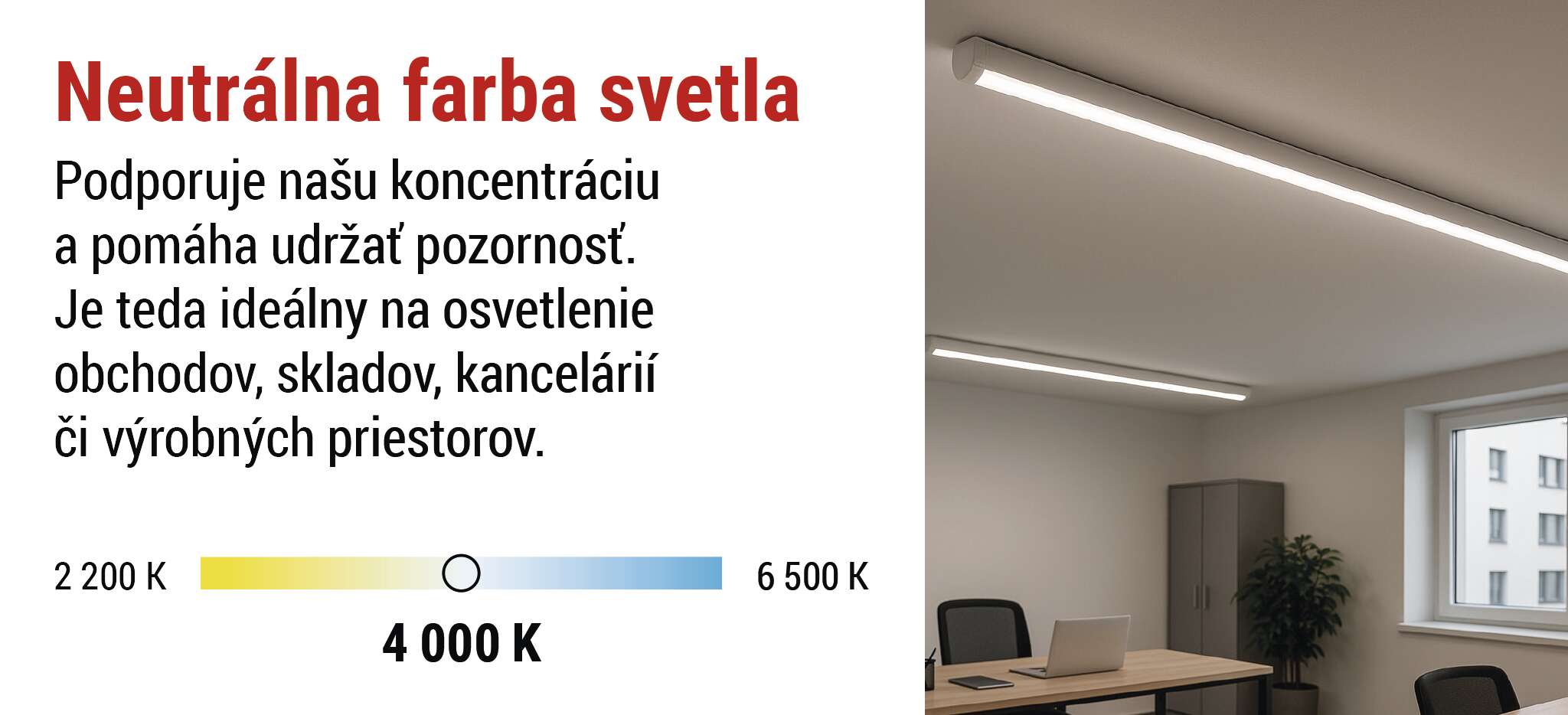 Neutrálna farba svetla vytvára ideálne podmienky na prácu a každodenné činnosti. Vyzerá prirodzene, neunavuje oči a hodí sa do širokého spektra prostredí - od kancelárií a obchodov až po priemyselné priestory. Všestranná voľba, ktorá vždy dosiahne správnu rovnováhu medzi výkonom a komfortom.