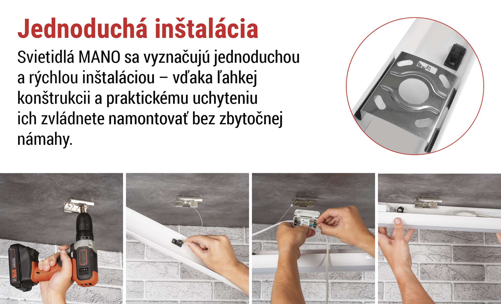 Vďaka dômyselnému dizajnu je inštalácia svietidiel MANO rýchla a bezproblémová. Svietidlo stačí pripevniť na strop alebo stenu a okamžite získate spoľahlivé osvetlenie bez zložitého zapojenia alebo špeciálneho náradia.