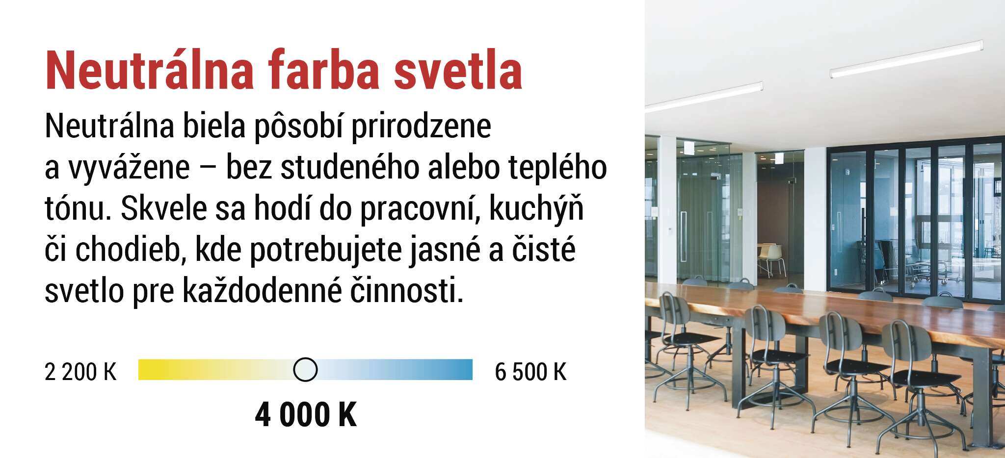 Svietidlá MANO svietia príjemným neutrálnym bielym svetlom, ktoré verne vykresľuje farby a neskresľuje okolie. Tento odtieň je ideálny pre pracovné a obytné priestory - pôsobí prirodzene, neunavuje oči a vytvára príjemnú atmosféru počas celého dňa. Vďaka rovnomernému rozloženiu svetla poskytuje jasné osvetlenie bez tieňov. Neutrálna biela farba sa tiež dokonale hodí do moderných interiérov, kde podčiarkuje čistý a elegantný vzhľad priestoru.