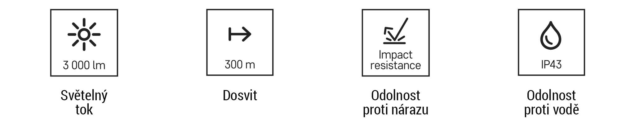 | dosvit | LED BOOST – 300 m, LED 100 % – 230 m, LED 50 % – 170 m, LED 20 % – 120 m |