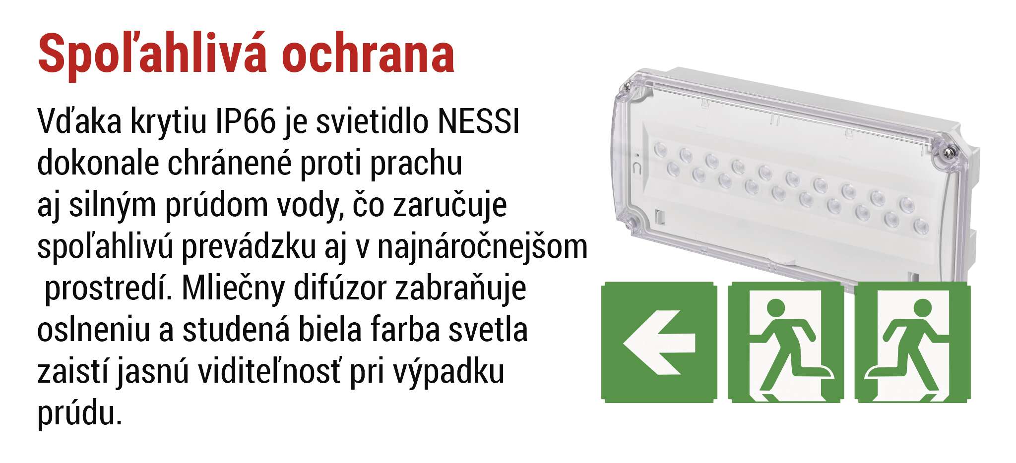 Núdzové svietidlo NESSI je kľúčovým prvkom každej budovy. Zabezpečuje, aby aj v prípade výpadku elektrickej energie zostala cesta k bezpečnému východu vždy jasne viditeľná. Vďaka modernému dizajnu a kvalitnému spracovaniu je svietidlo NESSI navrhnuté tak, aby fungovalo bez kompromisov v každej situácii a poskytovalo bezpečnosť tam, kde je to najviac potrebné.