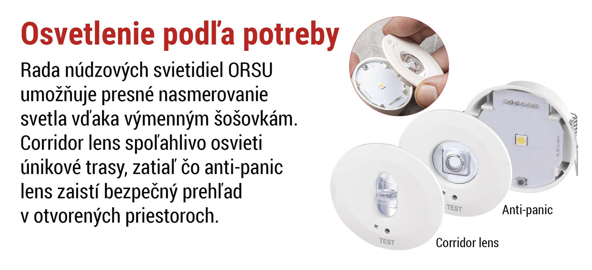 Šošovky umožňujú prispôsobiť osvetlenie konkrétnym potrebám priestoru. Koridorová šošovka sa používa v úzkych chodbách a priechodoch, napríklad v kanceláriách, školách alebo hoteloch, kde usmerňuje svetlo pozdĺž cesty a zabezpečuje rovnomerné a jasné označenie únikovej cesty. Šošovka Antipanic lens je určená do otvorených priestorov, ako sú vestibuly, foyer alebo verejné miestnosti, a vďaka širokému rozptylu svetla umožňuje bezpečnú orientáciu a pohyb aj v prípade, že sa v priestore súčasne nachádza viacero osôb. Dve šošovky tak poskytujú spoľahlivé a bezpečné osvetlenie presne podľa charakteru priestoru a jeho potrieb.