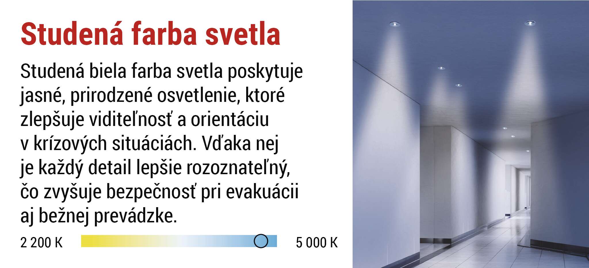 Vďaka studenej bielej farbe svetla núdzové osvetlenie jasne označuje únikové cesty a umožňuje bezpečný pohyb a orientáciu aj pri výpadku prúdu.