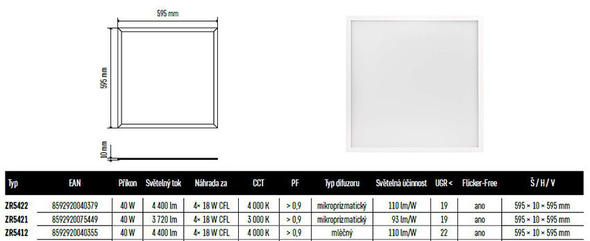 Kombinuje atraktívny štvorcový design spoločne s vysokou účinnosťou aj úspornosťou. Líši sa podľa svetelného toku, farby svetla, alebo uhlu vyžarovania. Vstavané svietidlo vo vnútri ukrýva veľmi úsporné LED diódy s vysokou svetelnou účinnosťou. Aj preto si výrobca mohol dovoliť poskytnúť predĺženú trojročnú záruku. Životnosť svietidla je skvelých 30 000 hodín. Behom nich vám bude mliečny difúzor z odolného plastu posielať príjemne rozptýlené svetlo v širokom uhle 120°.
