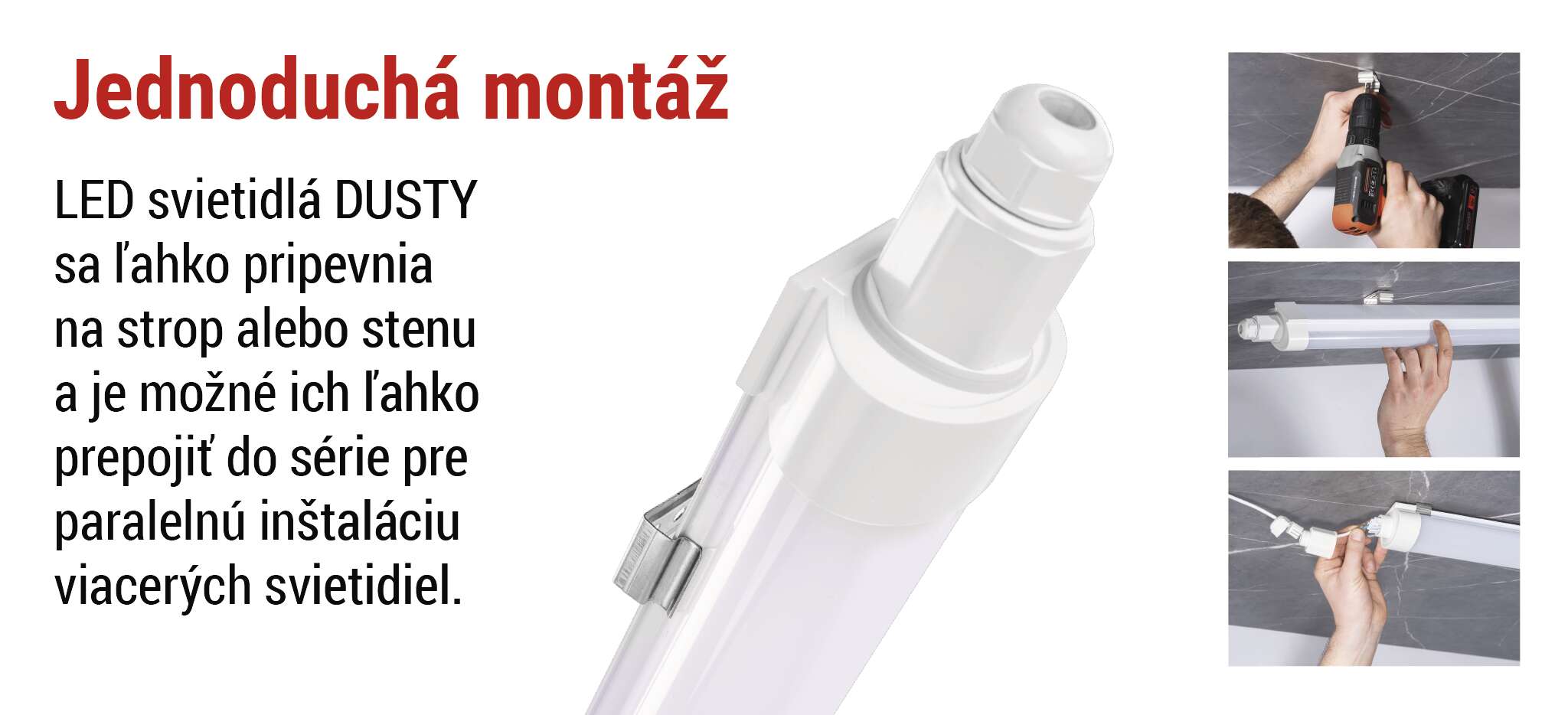 Naše prachotesné svietidlá myslia nielen na výkon a odolnosť, ale aj na vás. Premyslený dizajn a praktické detaily umožňujú rýchlu, jednoduchú a bezproblémovú inštaláciu. To vám ušetrí čas a náklady na inštaláciu bez toho, aby ste museli robiť kompromisy v kvalite alebo spoľahlivosti.