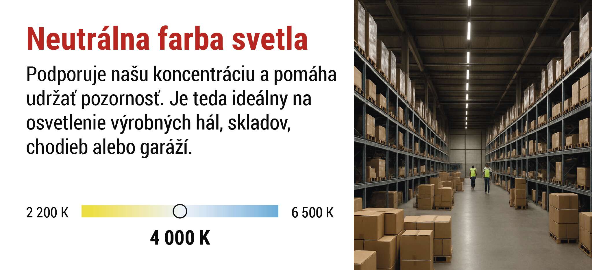 Neutrálna farba svetla vytvára ideálne podmienky na prácu a každodenné činnosti. Vyzerá prirodzene, neunavuje oči a hodí sa do širokého spektra prostredí - od kancelárií a obchodov až po priemyselné priestory. Všestranná voľba, ktorá vždy dosiahne správnu rovnováhu medzi výkonom a komfortom.