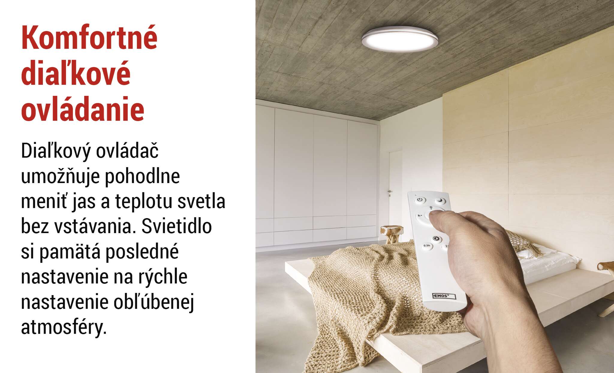 Môžete jednoducho prepínať medzi teplou a studenou bielou farbou, plynule stmievať a vytvoriť tak dokonalú atmosféru pre každý okamih - od pokojného večerného odpočinku až po sústredenú prácu. Pamäťová funkcia navyše umožňuje uložiť posledné nastavenia alebo jednu obľúbenú scénu, takže sa svetlo vždy prispôsobí vašim preferenciám. Vďaka diaľkovému ovládaniu je každodenné používanie svietidla úplne intuitívne a pohodlné a váš priestor okamžite nadobudne dokonalú atmosféru.