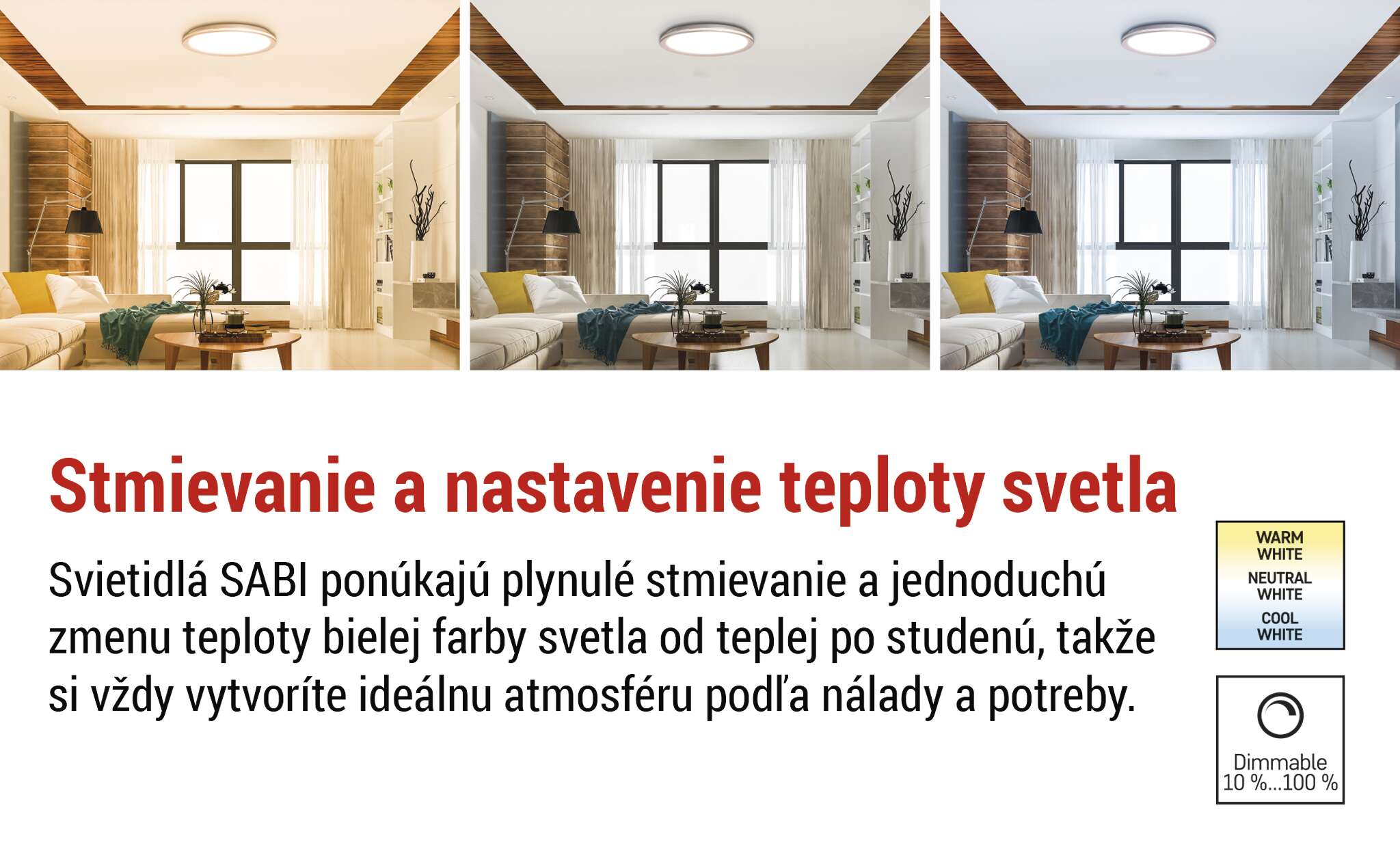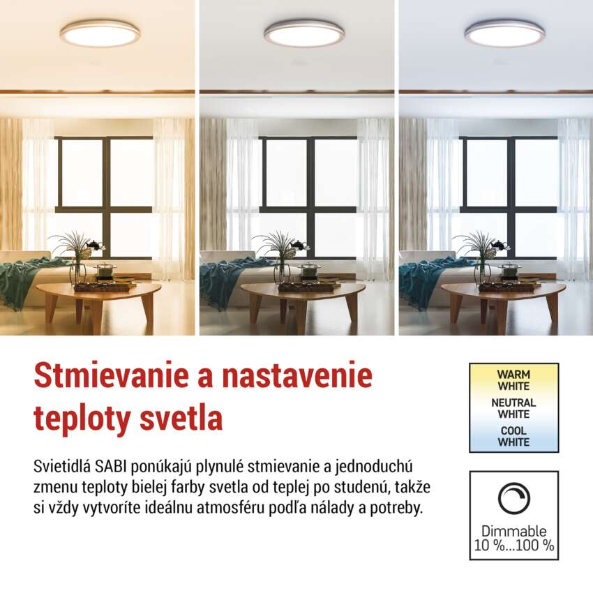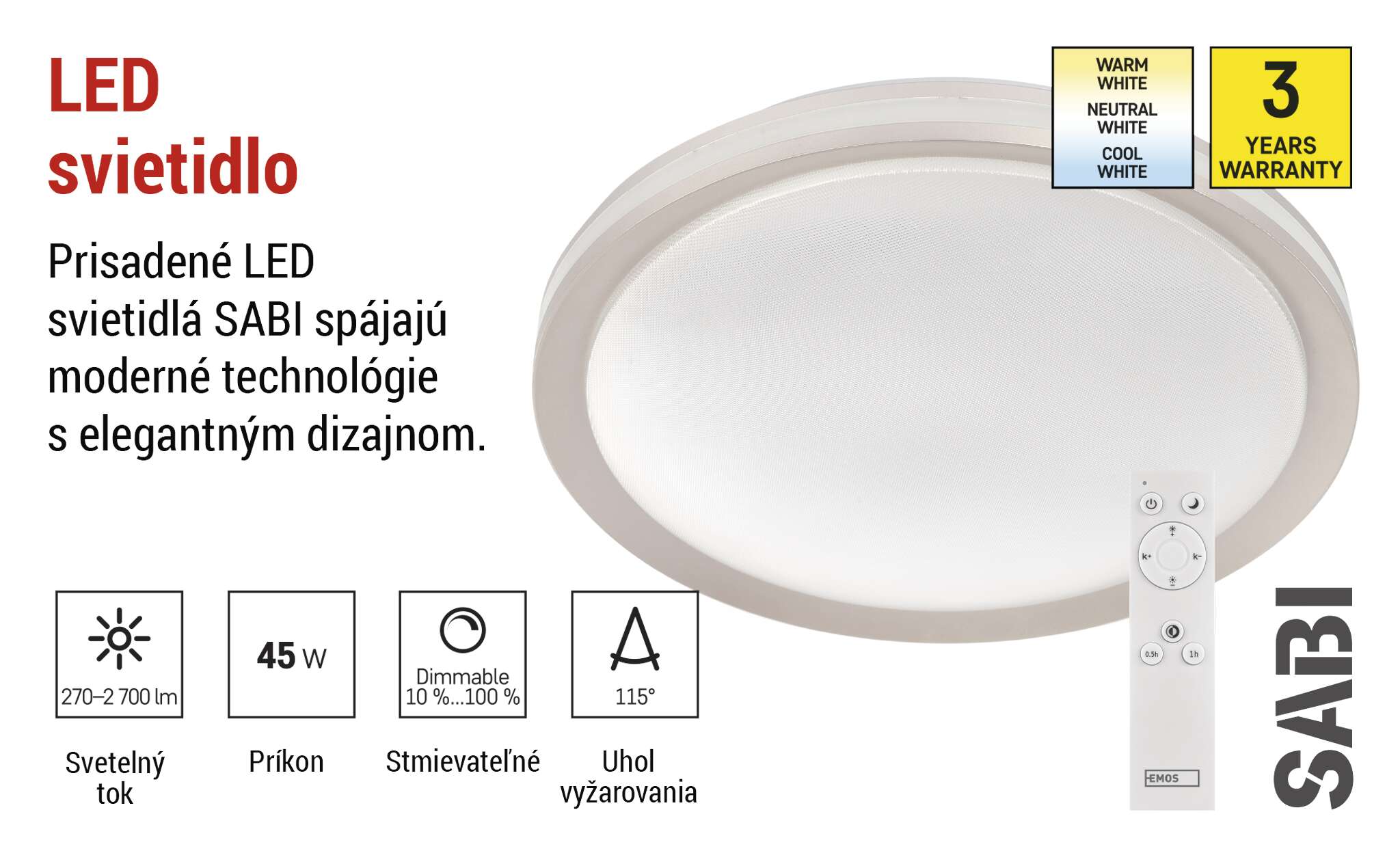Kombinácia moderného dizajnu a pokročilých funkcií, ktoré zabezpečujú pohodlné a štýlové osvetlenie v každom priestore - to sú svietidlá SABI LED. Vďaka diaľkovému ovládaniu môžete jednoducho regulovať jas a meniť teplotu bielej farby svetla z teplej na studenú. Svietidlá si pamätajú vaše posledné nastavenia a umožňujú uložiť obľúbené scény, takže vždy rýchlo dosiahnete ideálnu atmosféru. Štýlový staroružový prstenec spolu s difúzorom rovnomerne svieti a dodáva interiéru nadčasový vzhľad, zatiaľ čo zacvakávacia montáž zabezpečuje jednoduchú a rýchlu inštaláciu.