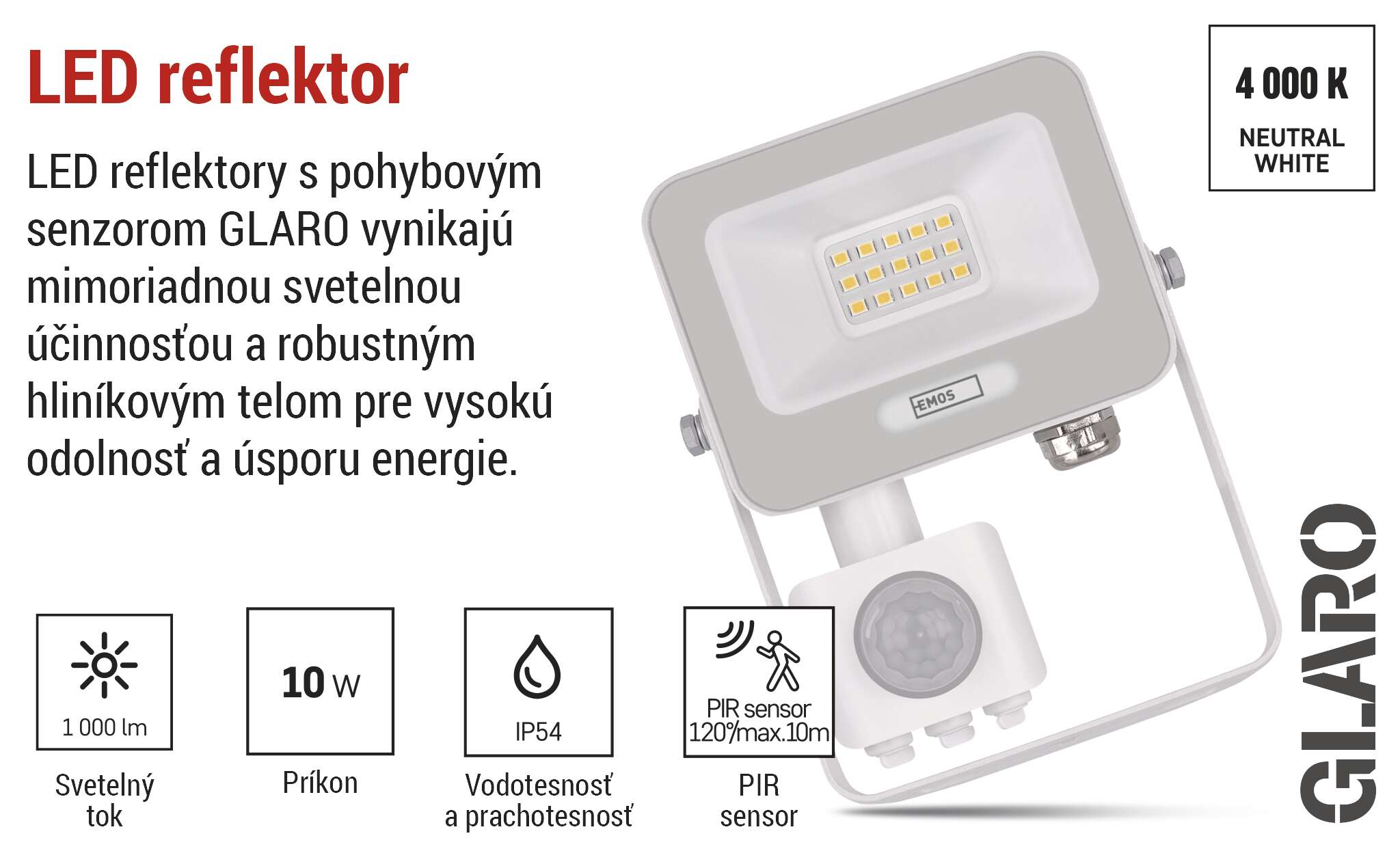 LED reflektory GLARO so senzorom PIR prinášajú pohodlné a energeticky úsporné vonkajšie osvetlenie. Vďaka automatickému spínaniu pri detekcii pohybu sa rozsvietia len vtedy, keď ich naozaj potrebujete - ideálne na zvýšenie bezpečnosti a pohodlia na vašom pozemku. Reflektory sú vhodné na montáž pod strechu alebo na stenu budovy s krytím IP54. Sú praktickým riešením na osvetlenie vchodov, garáží, záhradných chodníkov, príjazdových ciest a obchodných priestorov. Jednoduché nastavenie citlivosti snímača a dĺžky svietenia umožňuje prispôsobenie vašim potrebám.
