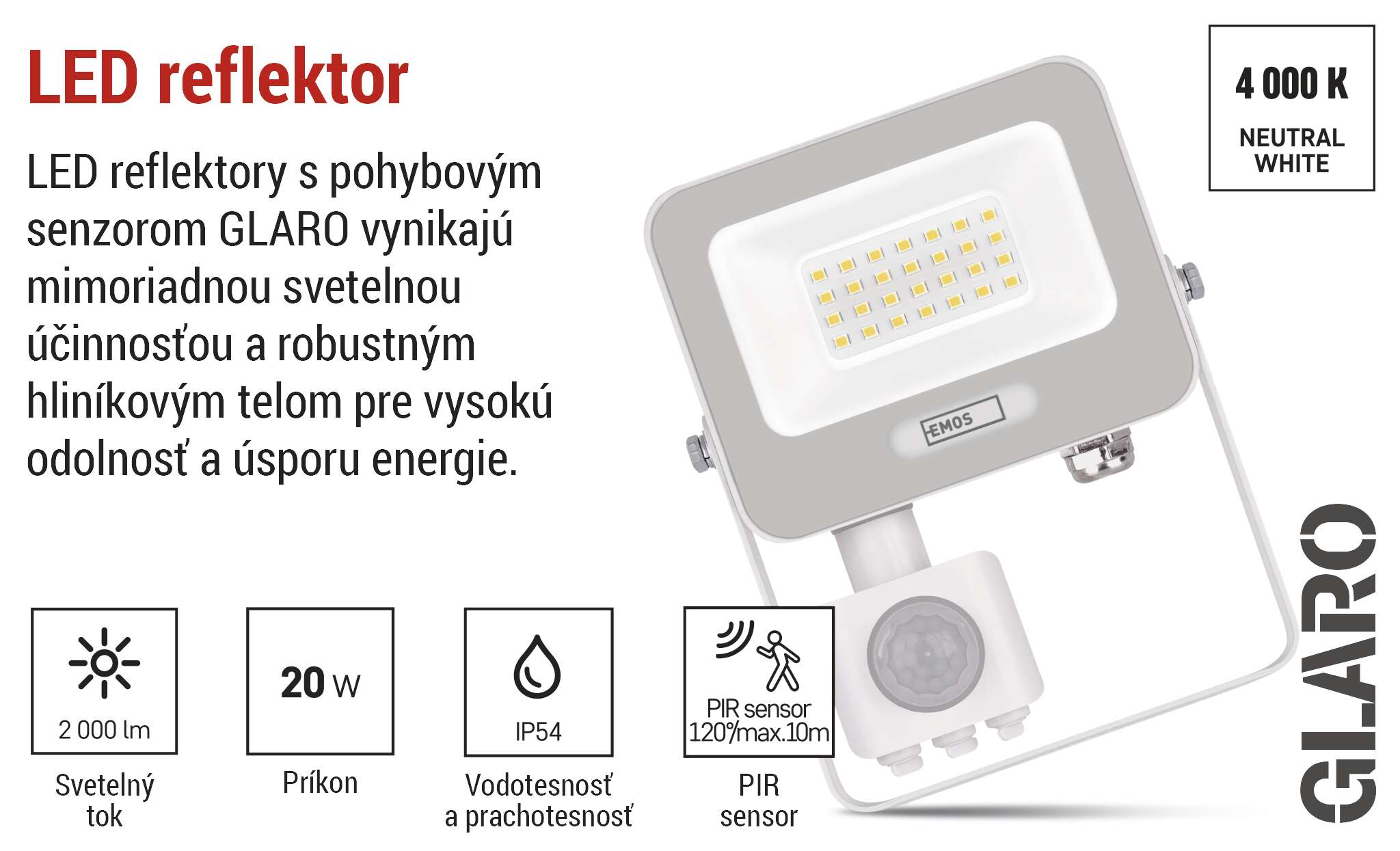 LED reflektory GLARO so senzorom PIR prinášajú pohodlné a energeticky úsporné vonkajšie osvetlenie. Vďaka automatickému spínaniu pri detekcii pohybu sa rozsvietia len vtedy, keď ich naozaj potrebujete - ideálne na zvýšenie bezpečnosti a pohodlia na vašom pozemku. Reflektory sú vhodné na montáž pod strechu alebo na stenu budovy s krytím IP54. Sú praktickým riešením na osvetlenie vchodov, garáží, záhradných chodníkov, príjazdových ciest a obchodných priestorov. Jednoduché nastavenie citlivosti snímača a dĺžky svietenia umožňuje prispôsobenie vašim potrebám.