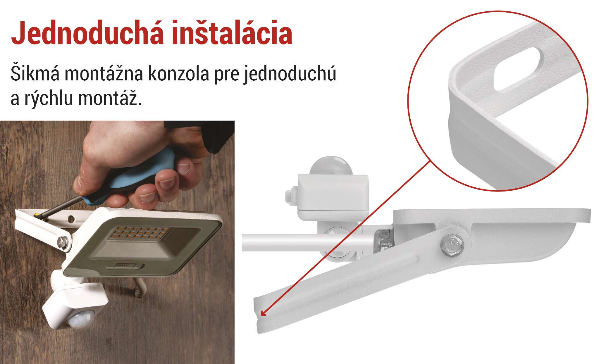 PIR reflektory GLARO sú navrhnuté s praktickou uhlovou montážnou konzolou, ktorá umožňuje rýchlu a pohodlnú inštaláciu na stenu, fasádu alebo iný podklad. Vďaka možnosti nastavenia uhla osvetlenia presne podľa potreby môžete svetlo nasmerovať tam, kde je najviac potrebné, bez potreby zložitého vŕtania alebo nastavovania. Jednoduchá inštalácia šetrí čas a námahu a robí zo svietidla GLARO ideálnu voľbu pre domáce inštalácie.