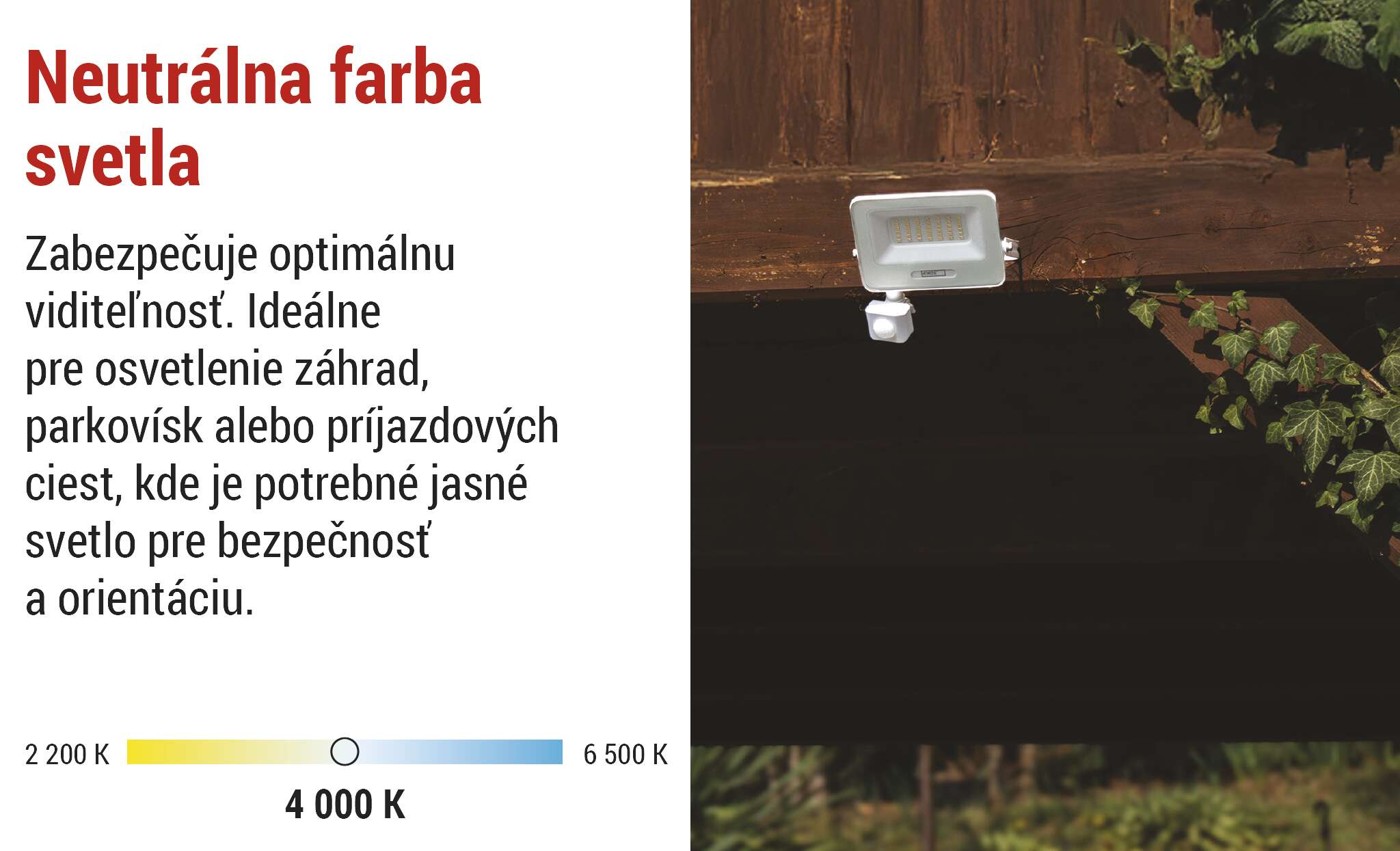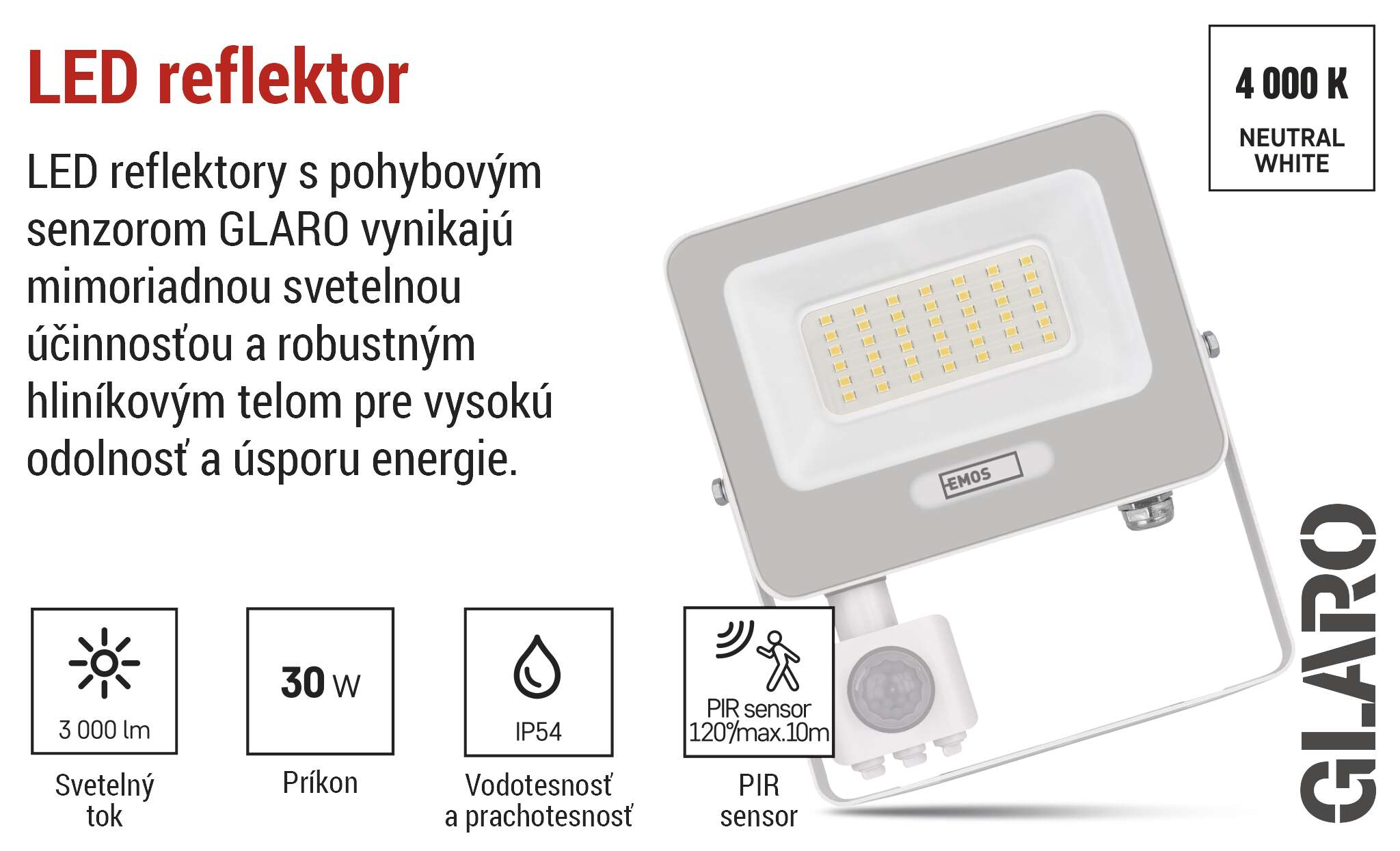 LED reflektory GLARO so senzorom PIR prinášajú pohodlné a energeticky úsporné vonkajšie osvetlenie. Vďaka automatickému spínaniu pri detekcii pohybu sa rozsvietia len vtedy, keď ich naozaj potrebujete - ideálne na zvýšenie bezpečnosti a pohodlia na vašom pozemku. Reflektory sú vhodné na montáž pod strechu alebo na stenu budovy s krytím IP54. Sú praktickým riešením na osvetlenie vchodov, garáží, záhradných chodníkov, príjazdových ciest a obchodných priestorov. Jednoduché nastavenie citlivosti snímača a dĺžky svietenia umožňuje prispôsobenie vašim potrebám.