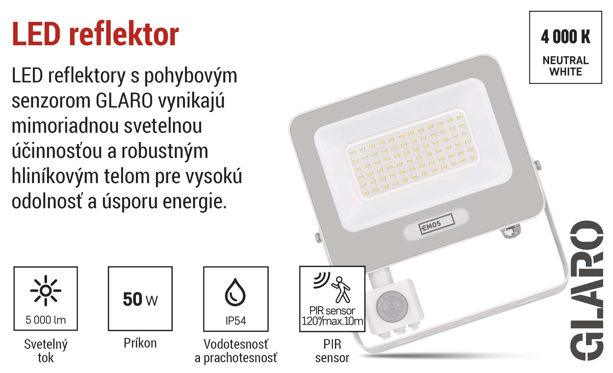 LED reflektory GLARO so senzorom PIR prinášajú pohodlné a energeticky úsporné vonkajšie osvetlenie. Vďaka automatickému spínaniu pri detekcii pohybu sa rozsvietia len vtedy, keď ich naozaj potrebujete - ideálne na zvýšenie bezpečnosti a pohodlia na vašom pozemku. Reflektory sú vhodné na montáž pod strechu alebo na stenu budovy s krytím IP54. Sú praktickým riešením na osvetlenie vchodov, garáží, záhradných chodníkov, príjazdových ciest a obchodných priestorov. Jednoduché nastavenie citlivosti snímača a dĺžky svietenia umožňuje prispôsobenie vašim potrebám.