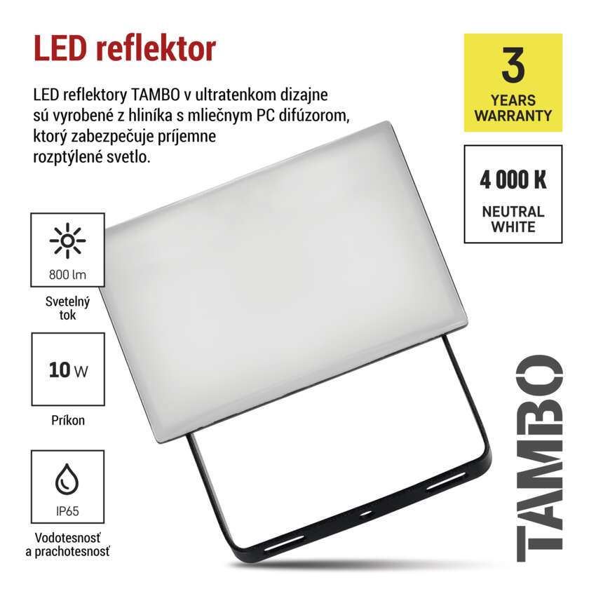 Rada reflektorov TAMBO vyniká svojim ultra tenkým prevedením. Súčasne poskytujú spoľahlivé osvetlenie v interiéri aj v exteriéri. Obstoja v podmienkach od mínus dvadsať stupňov po tropické teploty atakujúce + 40 °C. Pochvalu si zaslúžia za široký uhol osvetlenia 120°. Nahradí až 430W žiarovku a poskytujú svetelný tok až 4000 lm. Prevádzkové náklady sú naviac v porovnaní s bežnými halogénovými reflektormi nižšie až o 90 %. A to sa počíta.