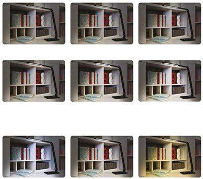 Farba svetla sa mení skokovo, hodnoty sú približne 3000K - 3300K - 3600K - 4000K - 4700K.