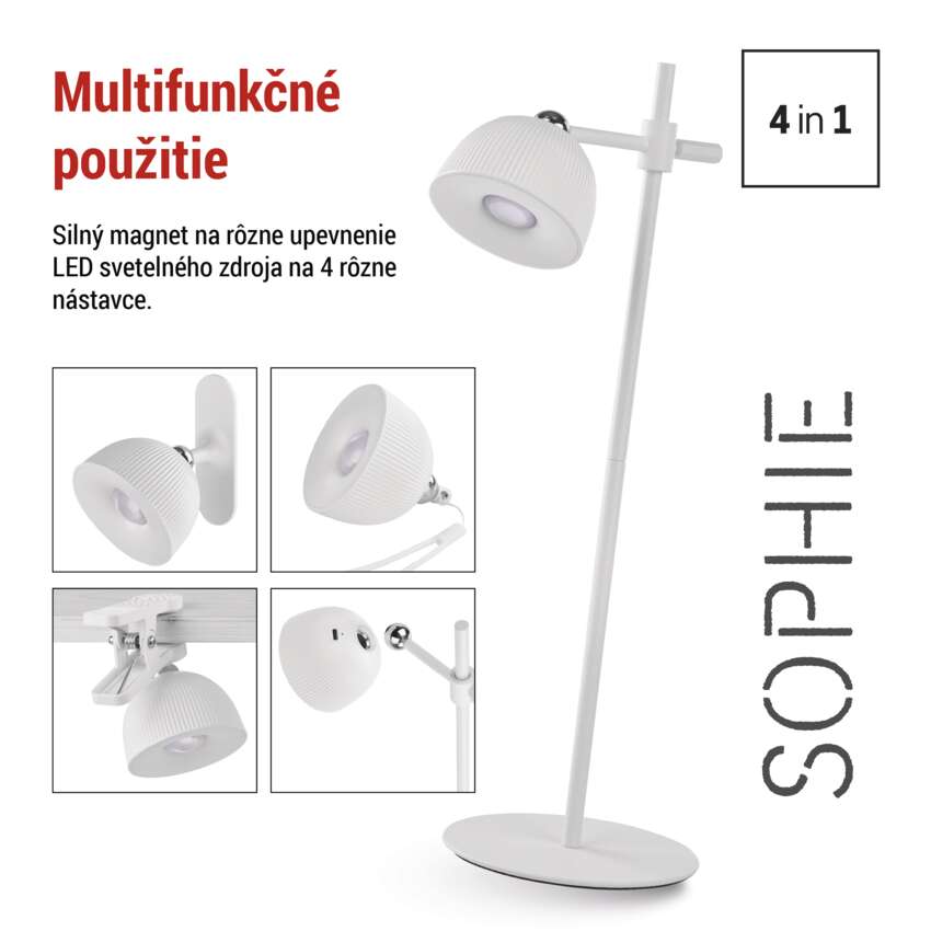 Objavte dokonalú kombináciu elegancie a funkčnosti s našou stolnou lampou SOPHIE. Štýlový matný biely dizajn a možnosť stmievania vytvárajú ideálnu atmosféru na každom pracovnom stole alebo nočnom stolíku. Lampa má 4 rôzne nástavce, ktoré umožňujú široké spektrum použitia. Vďaka tomu je lampa mimoriadne univerzálna pre akékoľvek prostredie.