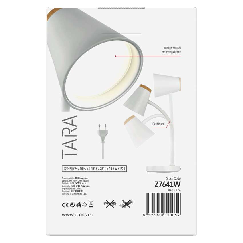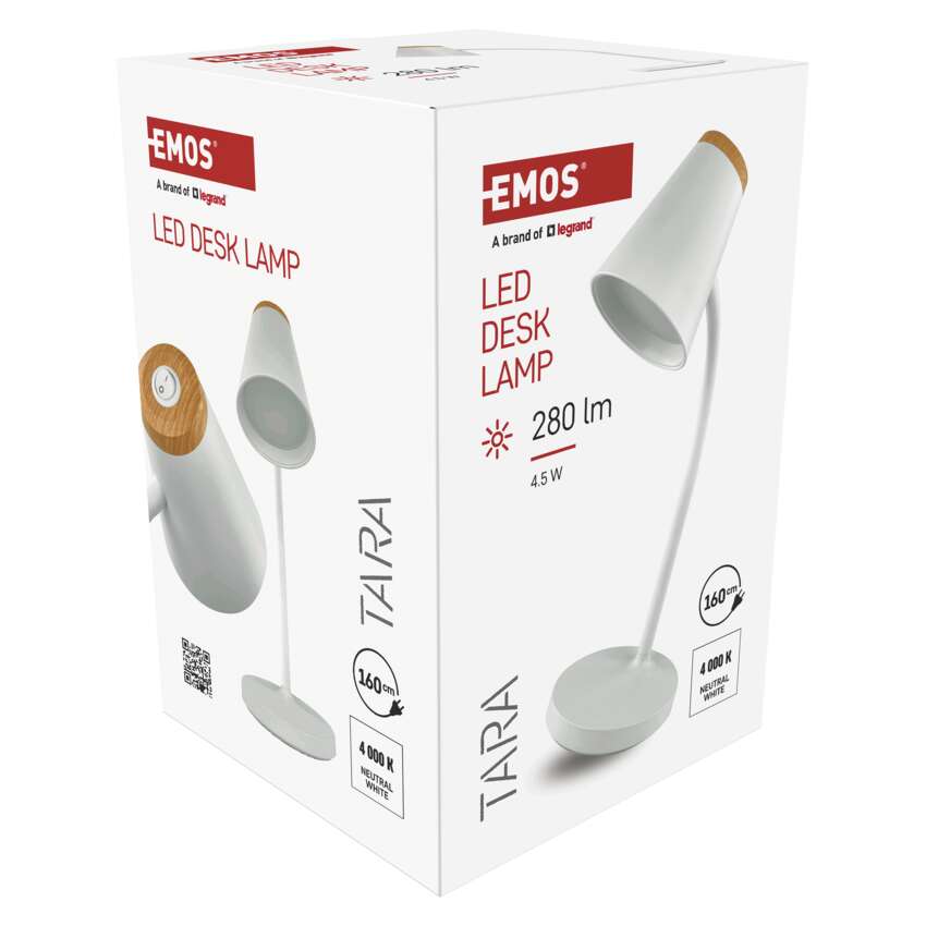 Stolná lampa EMOS TARA je dokonalou kombináciou moderného štýlu a jemného prírodného prvku. Jej minimalistické línie dopĺňa dekor imitujúci drevo, ktorý celému dizajnu dodáva hrejivý, prírodný nádych. Dodáva sa v bielej alebo čiernej farbe, takže ľahko zapadne do každého interiéru - od pracovne až po detskú izbu.