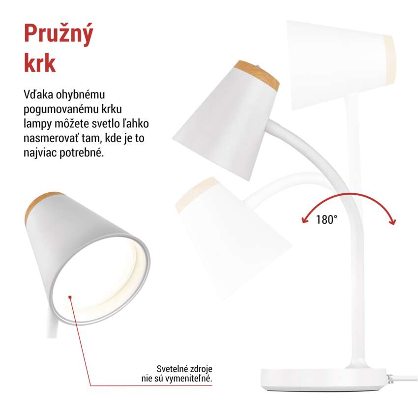 Integrovaný 4,5 W LED zdroj svetla poskytuje neutrálne biele svetlo (4 000 K), ktoré neunavuje oči a vytvára príjemnú atmosféru na sústredenú prácu a relaxáciu.